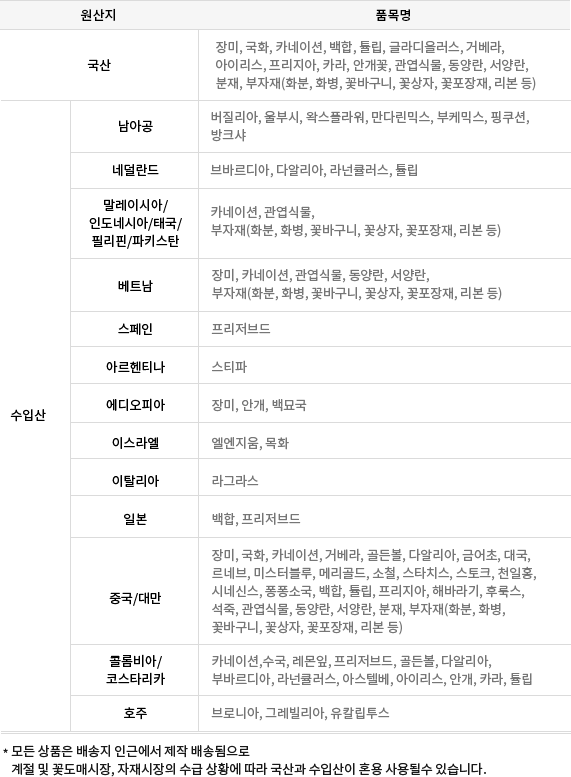 배송되는 제품의 꽃,화분,소재,부속품(포장,바구니,리본,카드,데코)등은 이미지와 별도로 시즌이나 배송지역에 따라 다를 수 있습니다